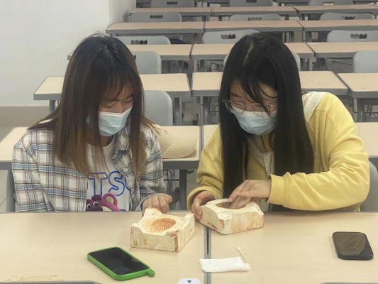 首先通过一个热身小游戏,使同学们彼此熟悉起来,心情慢慢放松。然后,张春侠介绍了伏里土陶悠久的发展历史以及土陶文化传承的现状。同学们认识到土陶文化的博大精深。最后,学习土陶的手工制作。两人一组,根据模具制作,每人负责一面。由于学生制作土陶经验不足,张春侠做了示范;从揉泥、压平、上模、合模、到25分钟出模、修模等环节,边讲解边示范。同学们很快上手,成功制作出古雅神秘的土陶。